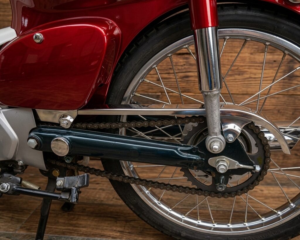 スーパーカブはチェーンカバー構造のため、
